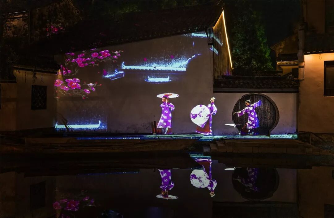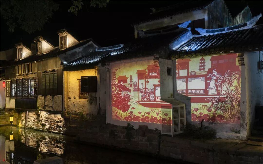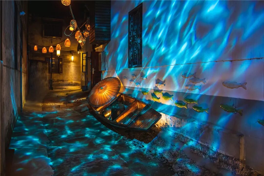 古朴的弄堂里,木船轻摇,墙面上鱼儿游过,一群群、一阵阵,欢快喜悦。如同水影般的灯光投射过来,展现出渔影粼粼的诗意。