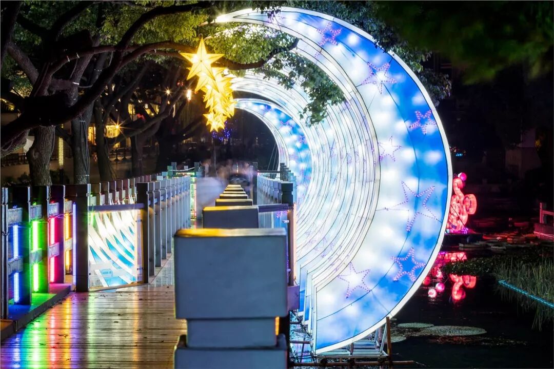 漫步在云海木栈道,抬头仰望,天上月牙弯弯,低头凝视,地上月灯如昼。天上、地上,共此良辰。月不止有一个,一个悬在天上,一个亮在心头。