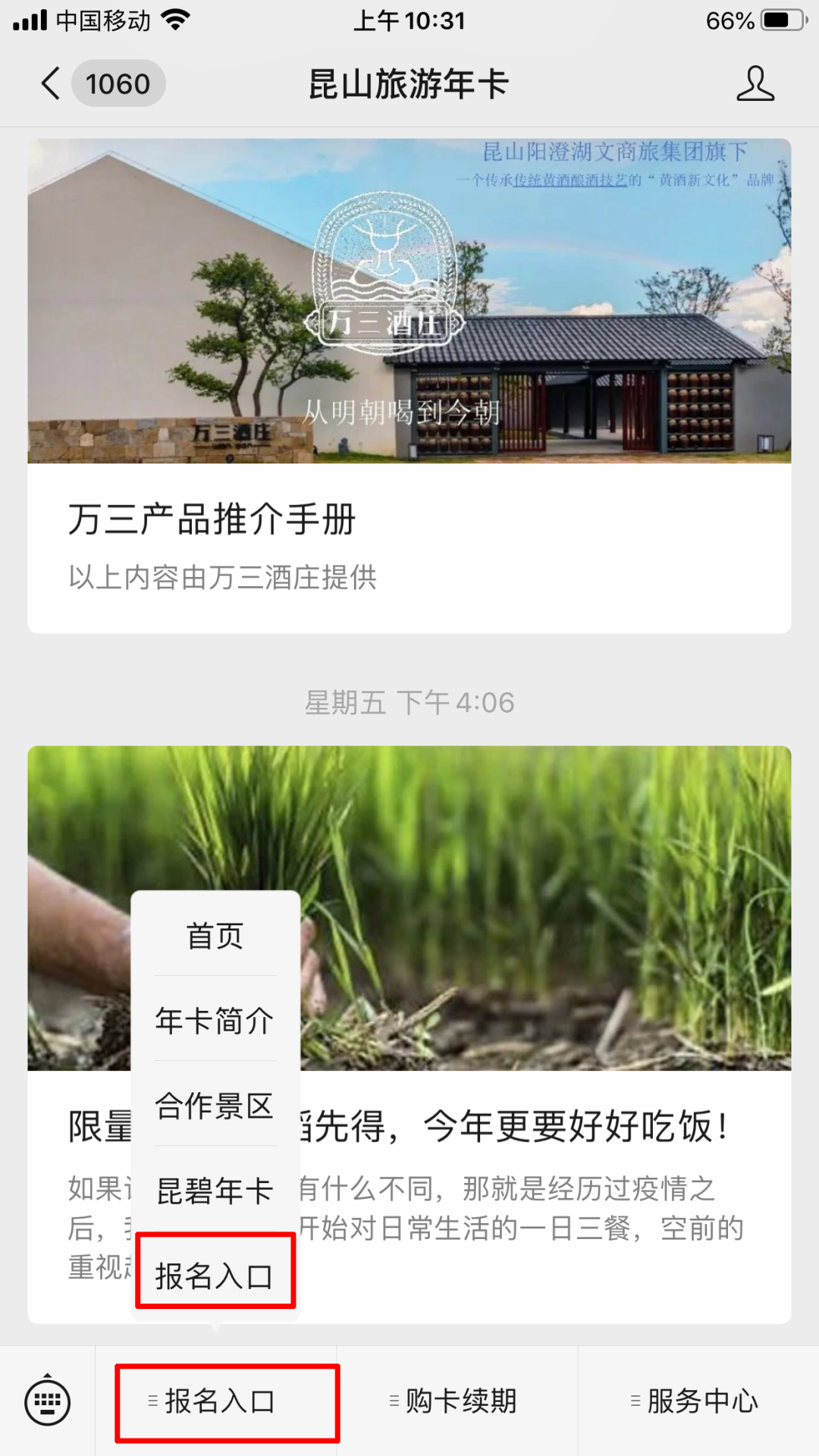 报名方式一:公众号搜索“昆山旅游年卡”公众号。并关注。